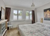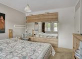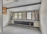 Slaapkamer 5 met veel licht, tapijt vloer, dakkapel aan de voorzijde en opbergkasten aan de achterzijde.