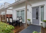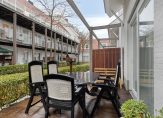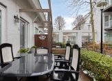 Zonnige tuin/terras op het westen met houtenvlonders en fraai uitzicht over de gezamenlijke binnentuin. Inpandige garage met elektrisch bedienbare stalen deur en elektra.