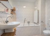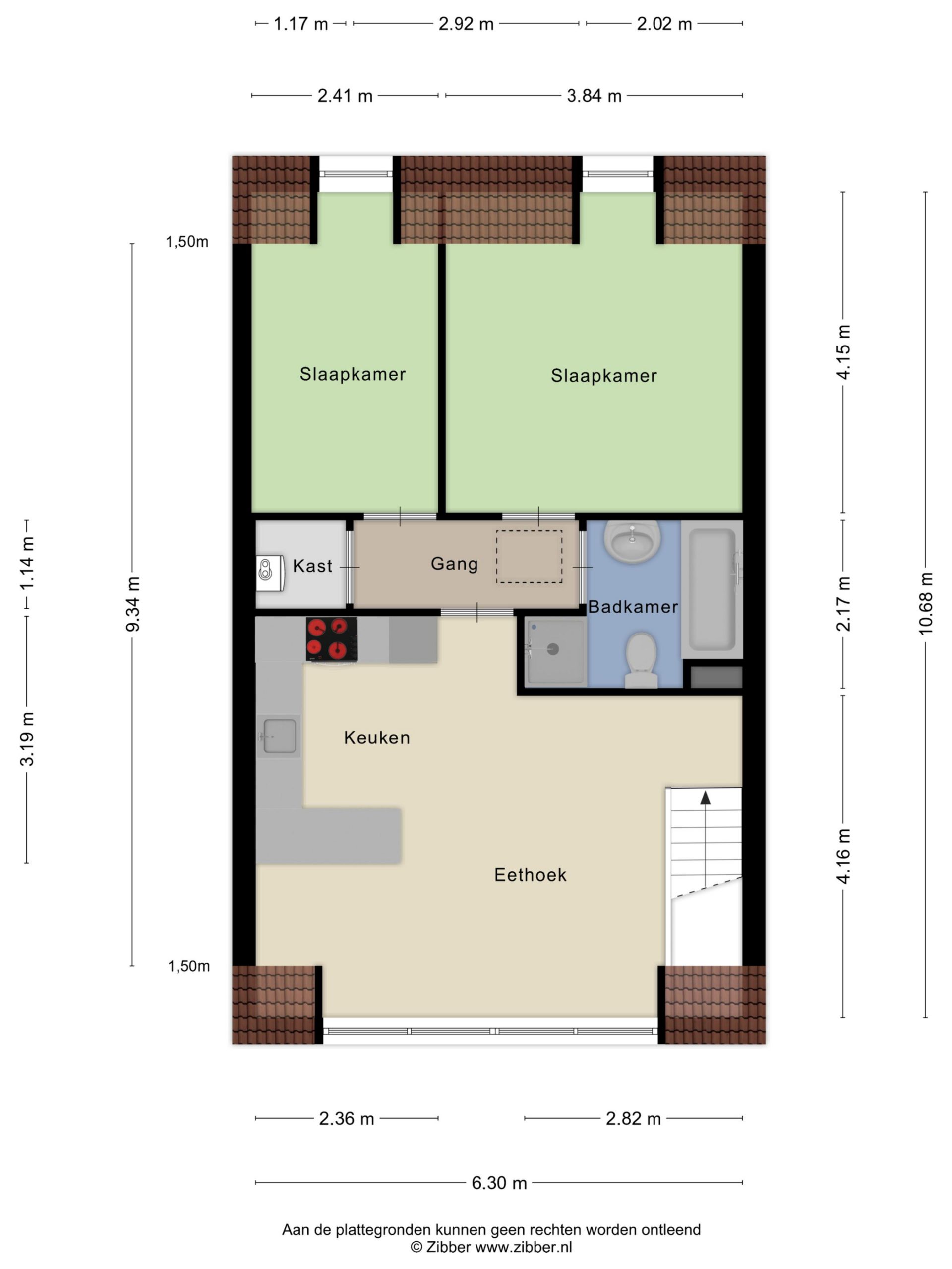 Slaapkamer 1 aan de achterzijde met laminaat vloer, stucwerk wandafwerking en dakkapel. Slaapkamer 2 aan de achterzijde met laminaat vloer, stucwerk wandafwerking en dakkapel. Deels betegelde badkamer met ligbad, douche, toilet, wastafel en afzuiging.