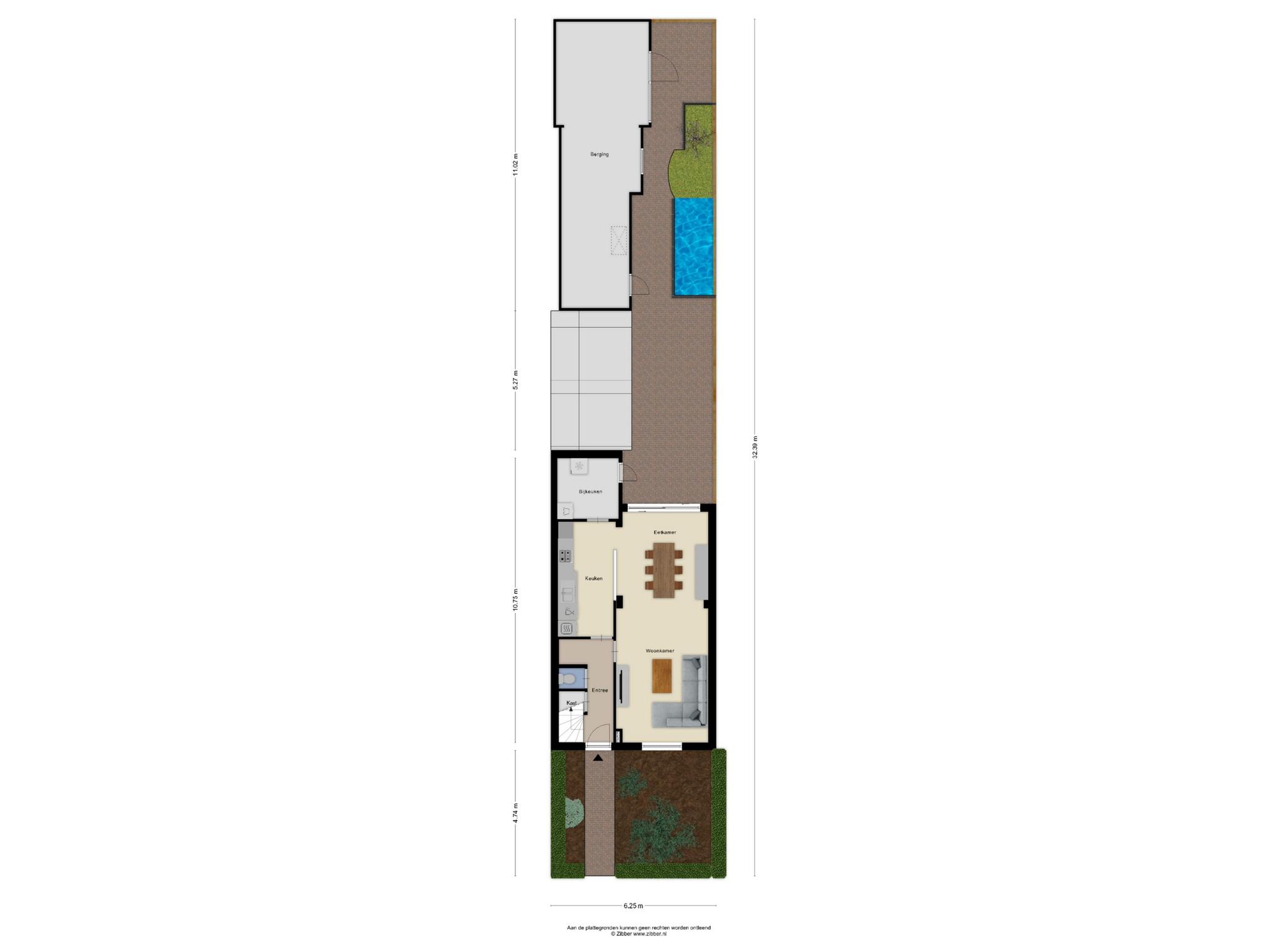 Voortuin met pad naar de voordeur en borders met vaste beplanting/ struikgewas. De achtertuin is voorzien van bestrating met een flink terras, een border, een vijver, buitenkraantje en een achterom. De zeer ruime garage en carport (ruim 32m2!) is gelegen achterin de tuin. Deze is voorzien van elektra en een bergvliering. De garage is bereikbaar middels een dubbele poort.