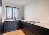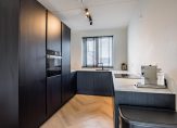 De keuken is in hedendaags zwart uitgevoerd, en ingericht met inductie kookplaat met ingebouwde afzuiging (Bora), koelkast, vriezer, electrische oven, quooker, vaatwasser en keramiek werkblad..