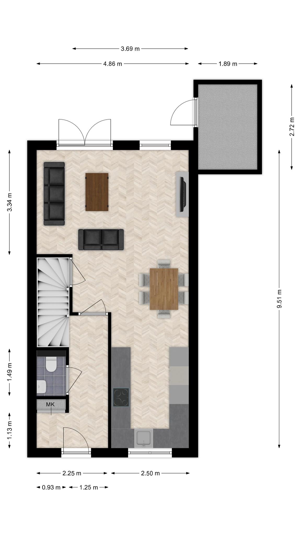 Woonkamer : ca. 5.25 m x 4.86/3.69 m