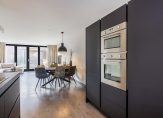 De ‘zwarte’ keuken aan de voorzijde is in een ruime en complete U-vorm opstelling geplaatst, en voorzien van uitgebreide ingebouwde apparatuur o.a. inductie kookplaat, afzuigkap, vaatwasser, koelkast, vriezer, combi oven/magnetron en electrische oven.