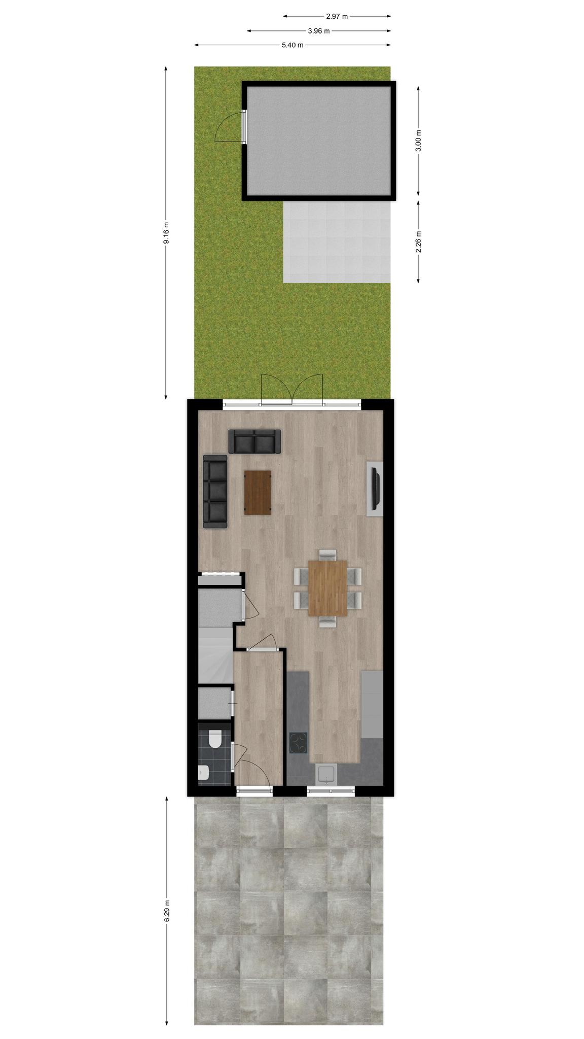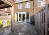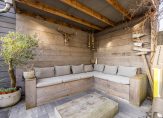 De openslaande deuren laten de overgang van binnen naar buiten vloeiend verlopen, en maken de achtertuin tot een verlengstuk van de woonkamer.
