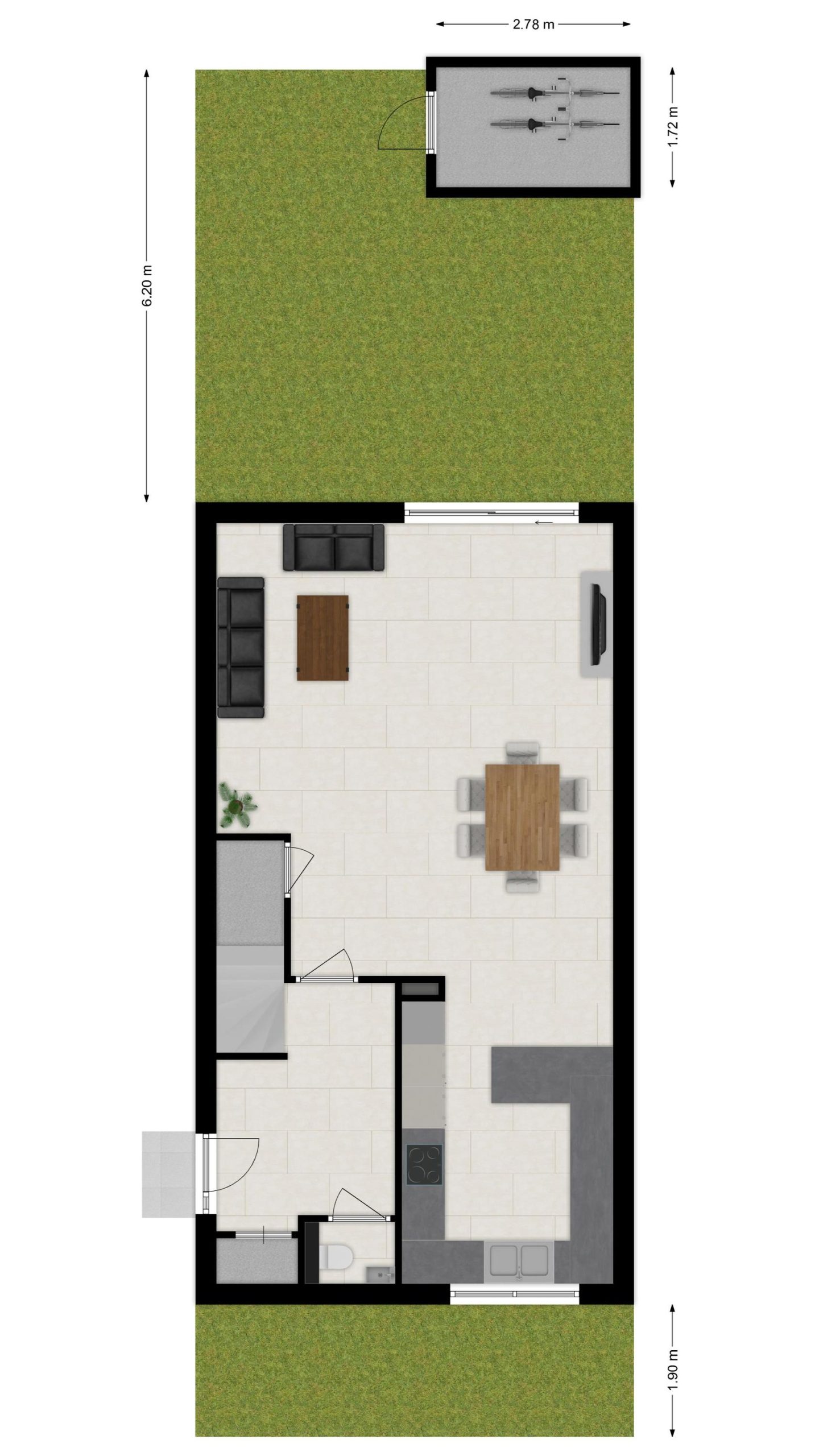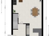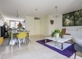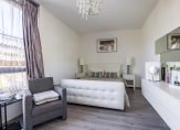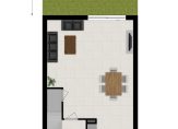 Deze tuingerichte living is bij de bouw reeds uitgebouwd, en meet thans een oppervlakte van 37 m2. Onder de trap is een kast gerealiseerd, waarin de regelunit voor de warmtepomp is geplaatst, met nog ruimte voor het opbergen van goederen.