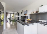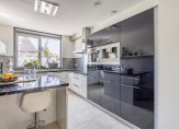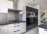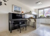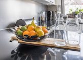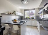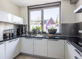 De luxe en uitgebreide keuken is aan de voorzijde in U-vorm geplaatst. Naast de vele bergruimte in de kasten zijn de volgende apparaten ingebouwd: koelkast, vriezer, inductie kookplaat, afzuigkap, vaatwasser, combi oven/magnetron en koffie-apparaat.
