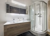 Overloop, hoofdslaapkamer met grote kastenwand aan de achterzijde, tussengelegen betegelde badkamer met ligbad, separate douchecabine, wastafelmeubel met 2 kranen en toilet, aan de voorzijde ruime 2e slaapkamer met extra nis voor berging en afgesloten berging met aansluitingen voor wasapparatuur en mechanische ventilatie.