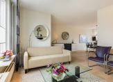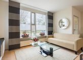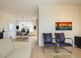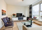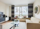 Aan de voorzijde van de living is de zithoek waaruit u volop van een vrij zicht over het water van de singel en het groen daar omheen kunt genieten.