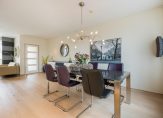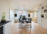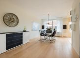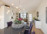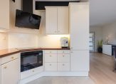 Aan de tuinzijde is door de breedte van de woning veel ruimte voor het plaatsen van een grote eettafel in combinatie met de open keuken. Deze open keuken is in L-vorm opgesteld en voorzien van diverse ingebouwde apparatuur o.a. vaatwasser (2020), inductie kookplaat (2024), afzuigkap (2024), combi oven/magnetron, koelkast en vriezer.