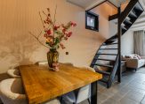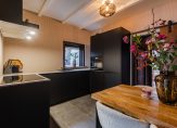 De woonkamer bevindt zich aan de voorzijde en beschikt over een knus zitgedeelte met onder andere glas-in-loodramen en een open trap naar de verdieping. Aan de achterzijde bevindt zich het eetgedeelte met de moderne, luxe zwarte keuken in U-opstelling, voorzien van inductiekookplaat, afzuigkap, vaatwasser, combi-oven/magnetron en koel-/vriescombinatie.