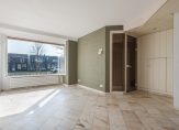 De vergrote (door iets van de hal te nemen) en riante L-vorm woonkamer met aan de voorzijde plezierige erker met uitzicht over de straat en de Goudse Vaart en met comfortabele marmer vloertegels met vloerverwarming.