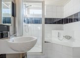 Vanuit de hal wordt de overloop van de eerste verdieping bereikt. Deze biedt toegang tot een tweetal achterslaapkamers en een voorslaapkamer met elektrische screen en deur naar balkon. De badkamer is compleet ingericht met ligbad, aparte douchecabine, wastafel, 2e toilet, en handdoekradiator.