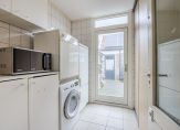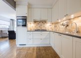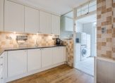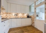 De aangebouwde keuken is voorzien van een L-vormige opstelling en voorzien van een 5-pitskookplaat, afzuigkap, vaatwasser, oven, koelkast en close-in boiler. Vanuit de keuken is er toegang tot de bijkeuken met aansluiting voor de wasmachine en droger en met deur naar achtertuin.