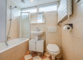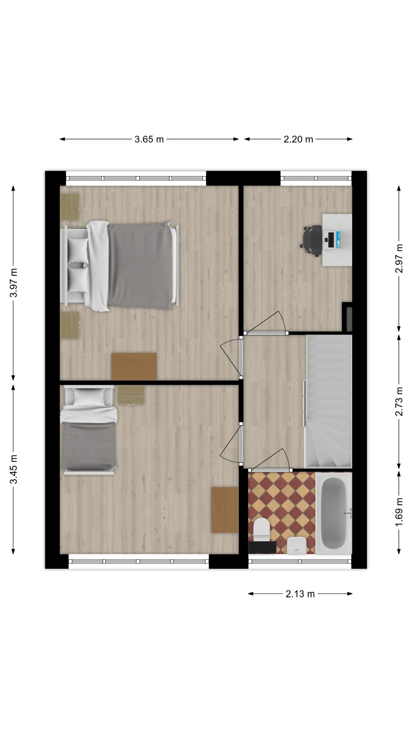 Overloop met vaste trap naar tweede verdieping, 2 slaapkamers aan de achterzijde waaronder de royale (hoofd)slaapkamer. Aan voorzijde is de 3e slaapkamer en de geheel betegelde badkamer voorzien van ligbad/douche, wastafel en hangend closet.