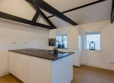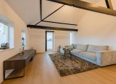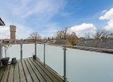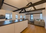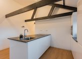 Aan de achterzijde is de royale en lichte woonkamer met aan 2 zijden raampartijen en is de originele houten kapconstructie nog in het zicht. De fraaie moderne open keuken met kookeiland is voorzien van inbouwapparatuur: inductie kookplaat, ingebouwde afzuiging, vaatwasser, koel- vriescombinatie en combi oven/magnetron. Vanuit de woonkamer heeft u tevens toegang tot een ruim en zonnig balkon met fraai en royaal uitzicht.