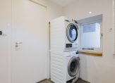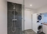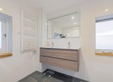 De fraai afgewerkte badkamer is volledig betegeld en voorzien van een inloopdouche, dubbele wastafelmeubel, elektrische vloerverwarming en aansluiting/afvoer voor de wasmachine.
