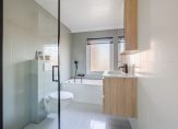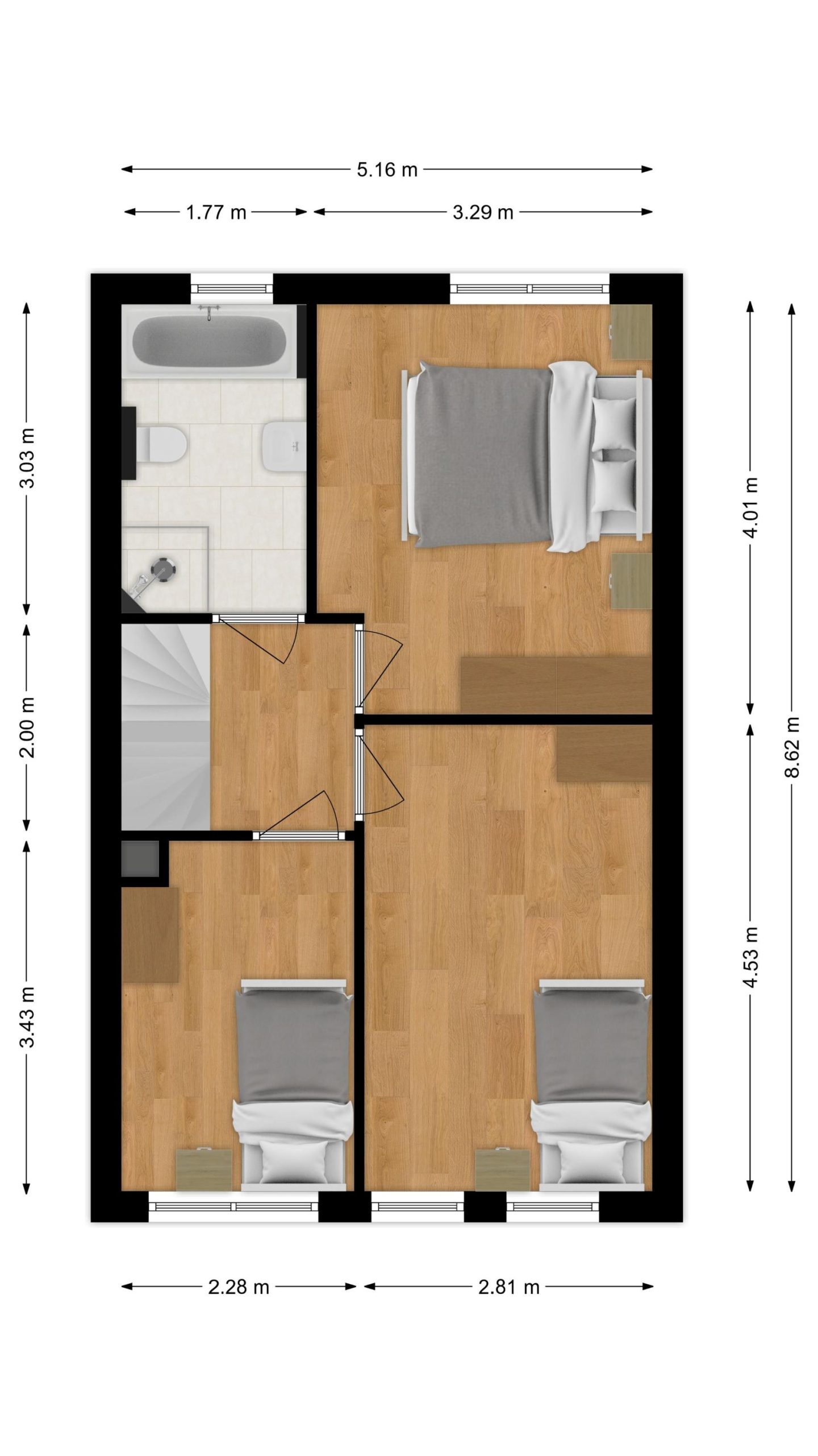 Via de afgesloten tussenhal bereikt u de overloop met toegang tot 3 slaapkamers en badkamer. Aan de voorzijde zijn 2 (een grote en een kleinere) slaapkamers en aan de achterzijde is de hoofdslaapkamer en de badkamer. De badkamer is ruim en compleet voorzien van inloopdouche, ligbad, wastafelmeubel, wandcloset en handdoekradiator.