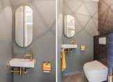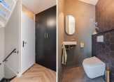 Overloop met trapopgang naar 2e verdieping, vernieuwde toiletruimte met fontein en toegang tot de woonkamer.