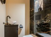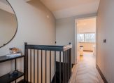 Overloop met trapopgang naar 2e verdieping, vernieuwde toiletruimte met wandcloset en fontein, en toegang tot de woonkamer.