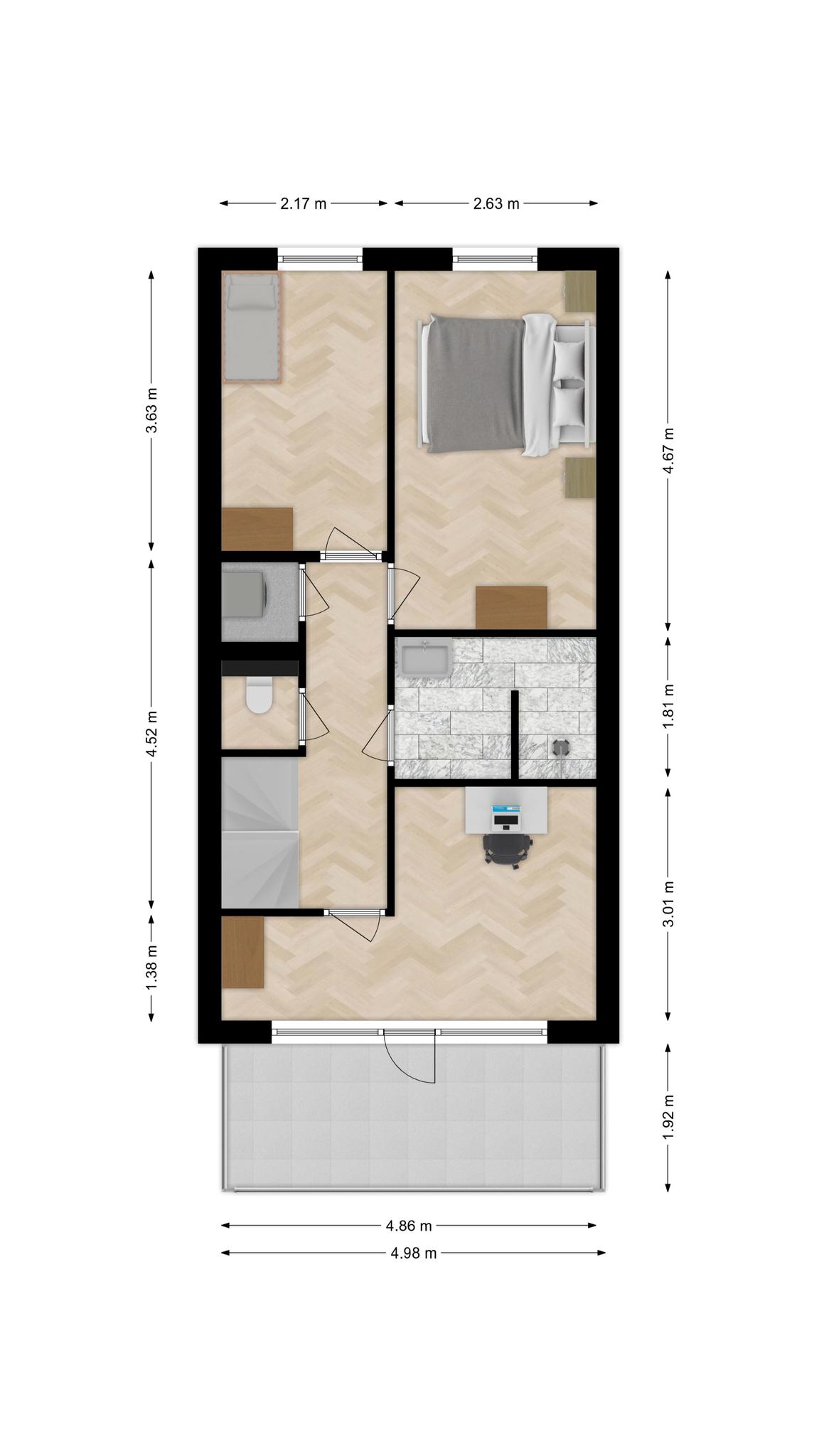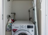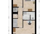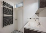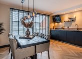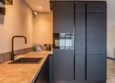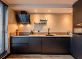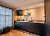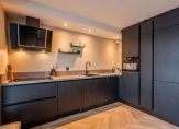 Aan de voorzijde is de moderne keuken gesitueerd met L-vormig keukenblok voorzien van een inductie kookplaat, afzuigkap, vaatwasser, koel- vriescombinatie en combi oven/magnetron. Vanuit de keuken is er een schuifpui naar Frans balkon.