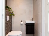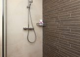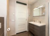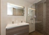 De badkamer is modern en comfortabel ingericht, geheel betegeld, met een inloopdouche met regendouche, een wastafelmeubel met energiezuinige kranen en een tweede toilet.