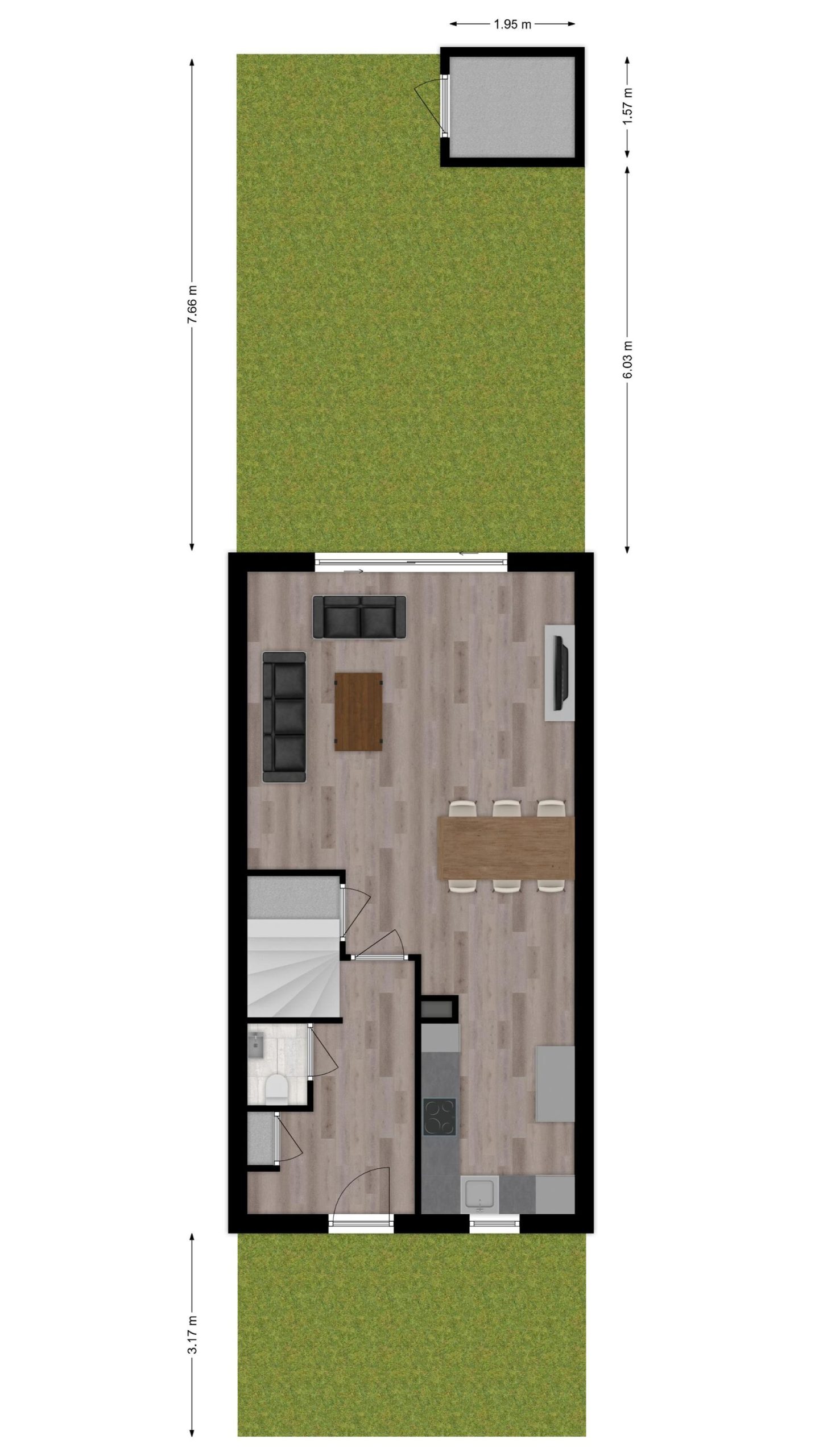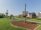 De voortuin kijkt uit over een rustig pleintje met speeltuintje, een plek waar kinderen veilig kunnen spelen zonder doorgaand verkeer.