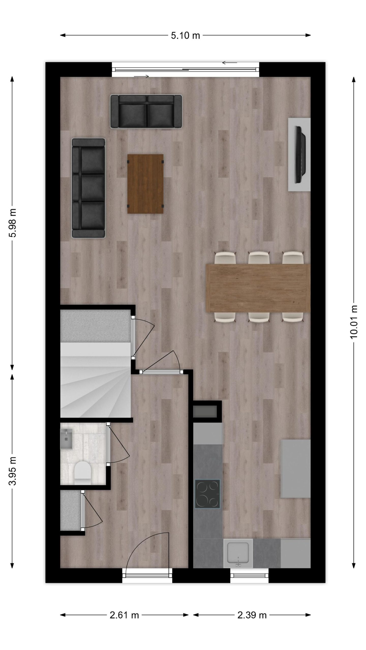 U komt binnen in een ruime hal met meterkast (uitgebreid, 13 groepen, 3 aardlekschakelaars en glasvezel aansluiting) en een betegeld toiletruimte met wandcloset en fontein. Vanuit hier loopt u door naar de verrassend lichte, met 1,20 meter uitgebouwde woonkamer, die door de grote schuifpui een fijne verbinding heeft met de tuin. De trap-/voorraadkast met extra draaibaar inzetmeubel biedt slimme opbergruimte.