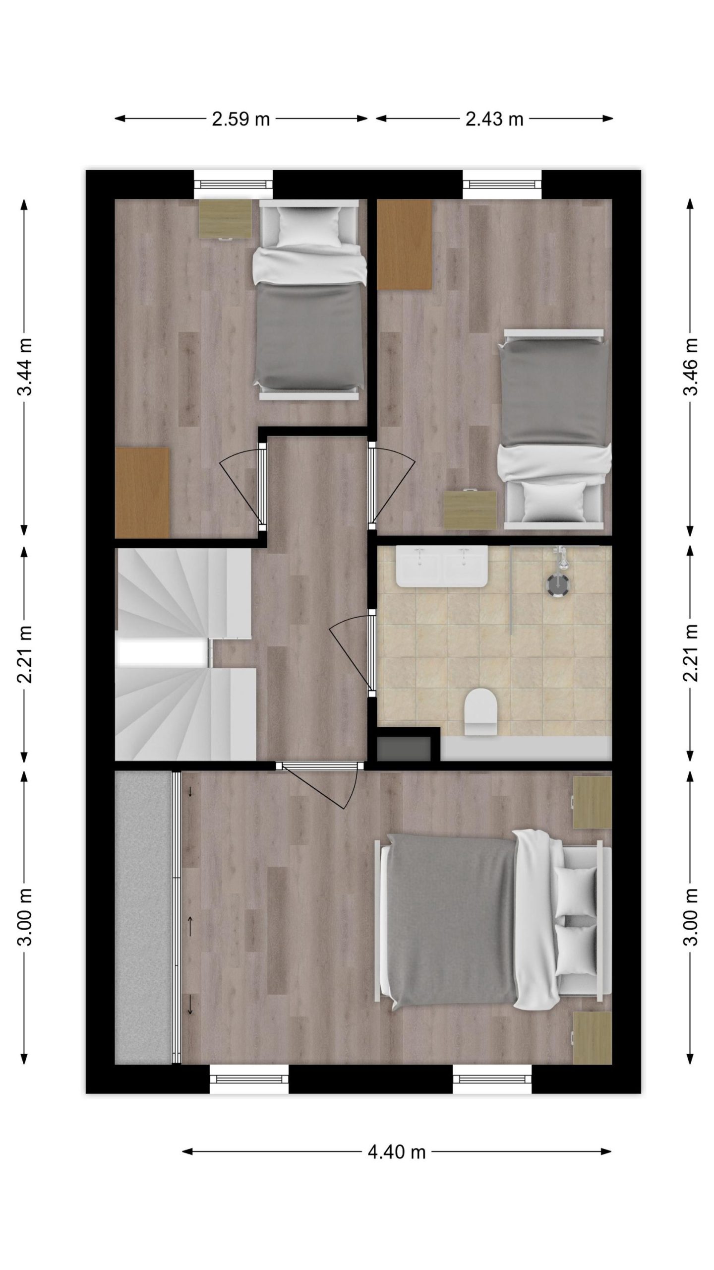 Op de eerste verdieping treft u aan de voorzijde een royale ouderslaapkamer over de gehele breedte van de woning. De schuifkastenwand en de grote raampartijen maken het een fijne, rustige ruimte. Aan de achterzijde bevinden zich nog twee praktische slaapkamers, ideaal voor kinderen, logees of hobby.