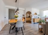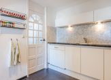 Via de voordeur komt u in een zeer ruim opgezette hal met lichtkoepel, welke toegang biedt tot alle vertrekken. Aan de voorzijde is de ruime en heerlijk lichte woonkamer met uitzicht op en over de straat. De keuken is halfopen en in L-vorm opgesteld voorzien van: vaatwasser, oven, 4-pits gaskookplaat, afzuigkap en koel- vriescombinatie.