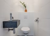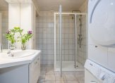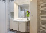 In de overgang naar het slaapgedeelte treft u de badkamer, het toilet en een bergkast. De badkamer, eveneens met lichtkoepel, is uitgerust met wastafelmeubel, douchecabine, handdoekradiator, alsmede het aansluitpunt voor de wasmachine en droger. Het toilet is in 2011 geheel gemoderniseerd en voorzien van een vrijhangend closet, fontein en afzuiging.