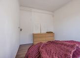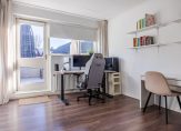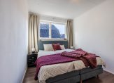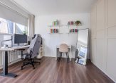Aan de achterzijde van het appartement bevinden zich een 2-tal ruime slaapkamers, waarvan de grote slaapkamer, die nu in gebruik is als werkkamer, tevens toegang biedt tot het royale en vrije dakterras.