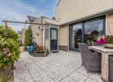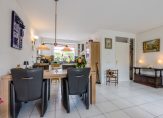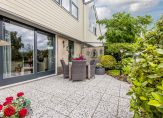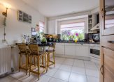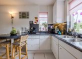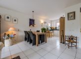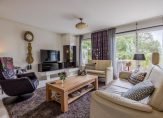 De royale tuingerichte leefruimte is een heerlijke plek voor het gezin. Door de grootte van deze ruimte combineert u gemakkelijk een grote eettafel met een ontspannen zit voor het gezin. De bij het woongedeelte geplaatste haard (voorheen gashaard, thans electrisch) biedt een sfeervolle en warme toevoeging van het zitcomfort.