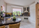De open keuken is in U-vorm opgesteld, in lichte kleuren uitgevoerd, en voorzien van ingebouwde apparatuur o.a. keramische kookplaat, afzuigkap, electrische oven, keuken-boiler, koelkast en vaatwasser.