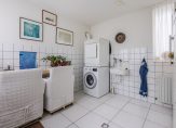Vanuit het woongedeelte heeft u de doorgang naar de verlengde garage. De garage is in 2 delen opgesplitst, nl. aan de voorzijde met loopdeur en electrisch bedienbare en geïsoleerde deur voor het eventueel opstellen van een auto, en aan de achterzijde als bijkeuken. In deze ruimte bevinden zich de aansluitingen voor de wasapparatuur en een uitstort gootsteen.