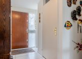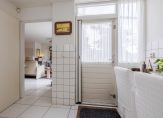 Entree van de woning, ruime hal met tegelvloer, ruime garderobe, meterkast (uitgebreid, 12 groepen, aardlekschakelaar en glasvezel), toiletruimte met luxe wandcloset (inclusief douche) en fontein en ruime tuingerichte living met aan voorzijde opgestelde keuken.
