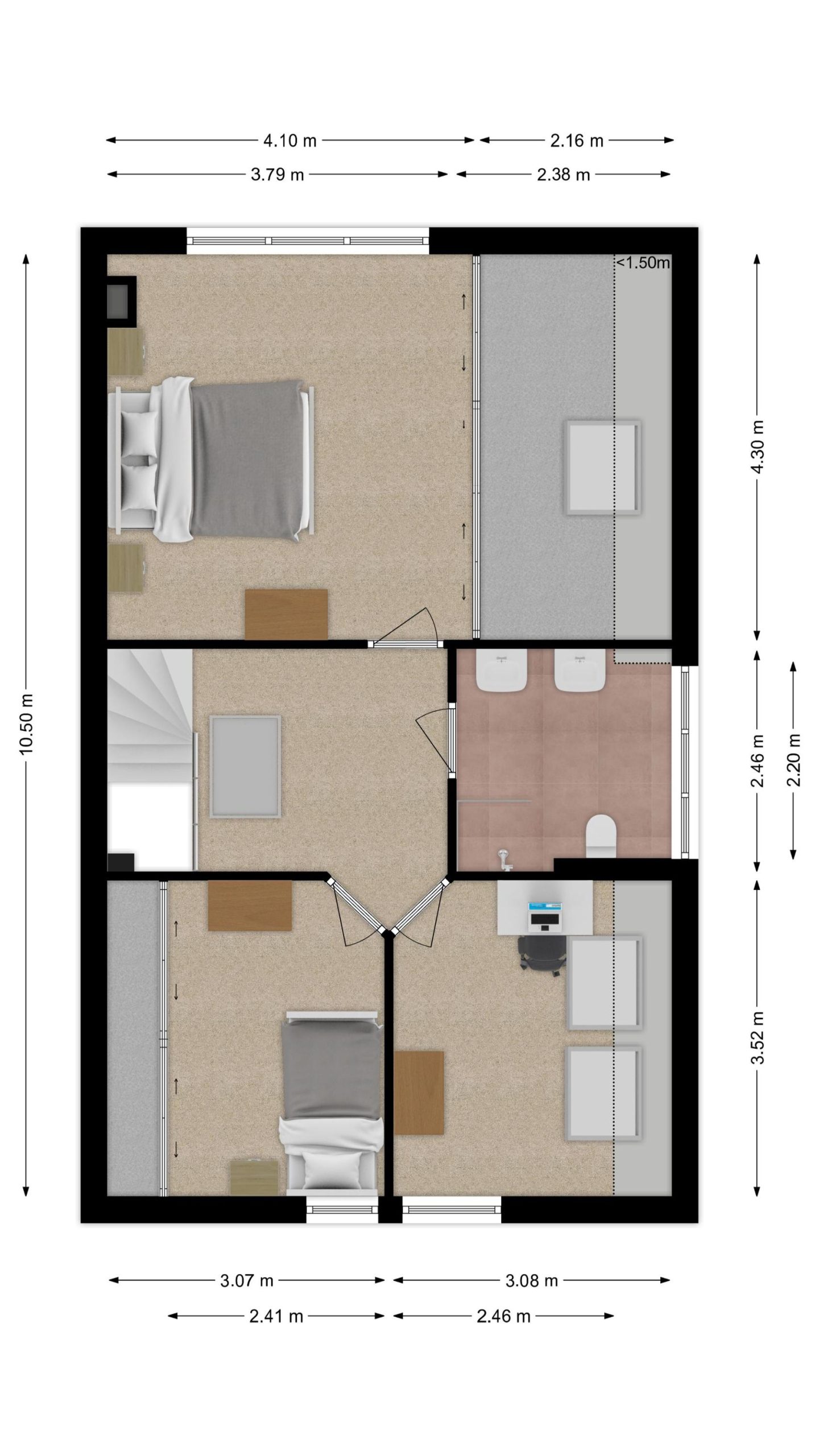 Vanuit de hal biedt de trapopgang toegang tot de verdieping. Aan de voorzijde van de woning zijn 2 praktische (kinder) slaapkamers en aan de achterzijde is de grote (hoofd)slaapkamer met airco en grote inloopkast (walk in closet).