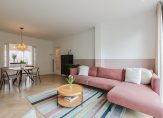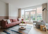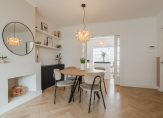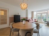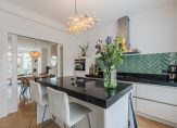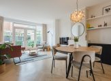 Via stijlvolle kamer-en-suite deuren komt u in de lichte en ruime woonkamer met maatwerk kasten. Door de uitbouw heeft de woonkamer een oppervlakte van circa 26 m² en beschikt deze over openslaande deuren naar de achtertuin. De sfeervolle showhaard, strak gestucte wanden en de fraaie houten visgraatvloer met hoge plinten maken deze ruimte compleet.