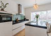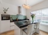 Aan de voorzijde van de woning bevindt zich de ruime en gezellige woonkeuken. De Siematic design keuken (2010) is uitgevoerd in hoogglans wit met een donker composiet werkblad. De keuken is voorzien van hoogwaardige Siemens inbouwapparatuur, waaronder een gaskookplaat, afzuigkap, koelkast, vaatwasser en een combi oven/magnetron. Het kookeiland met spoelbak biedt een fijne plek om te zitten en maakt de keuken tot een echte leefruimte.