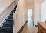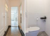 Via de entree komt u binnen in een karakteristieke, hoge hal met authentieke granieten vloer, hoge plinten en fraaie paneeldeuren. In de hal bevinden zich de vernieuwde meterkast, een moderne toiletruimte met fonteintje en de trapopgang naar de eerste verdieping. Onder de trap is een praktische kelderkast gesitueerd. Vanuit de hal bereikt u de betegelde bijkeuken/berging (ca. 10 m²), voorzien van wasmachineaansluiting en volop bergruimte.