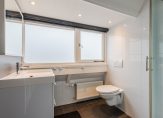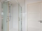 De moderne badkamer is uitgevoerd in een grijs-witte kleurstelling en voorzien van een douchecabine, wastafelmeubel en toilet.