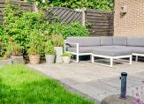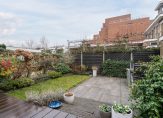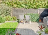 De onderhoudsvriendelijk aangelegde achtertuin is bereikbaar via zowel de woonkamer als de bijkeuken. De beschutte tuin van circa 50 m², gelegen op het noordoosten, biedt veel privacy en een prettige combinatie van zon en schaduw. De berging bevindt zich naast de deur naar de bijkeuken.