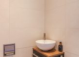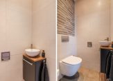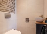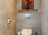 De toiletruimte is modern en luxe uitgevoerd met wandcloset en strak tegelwerk.