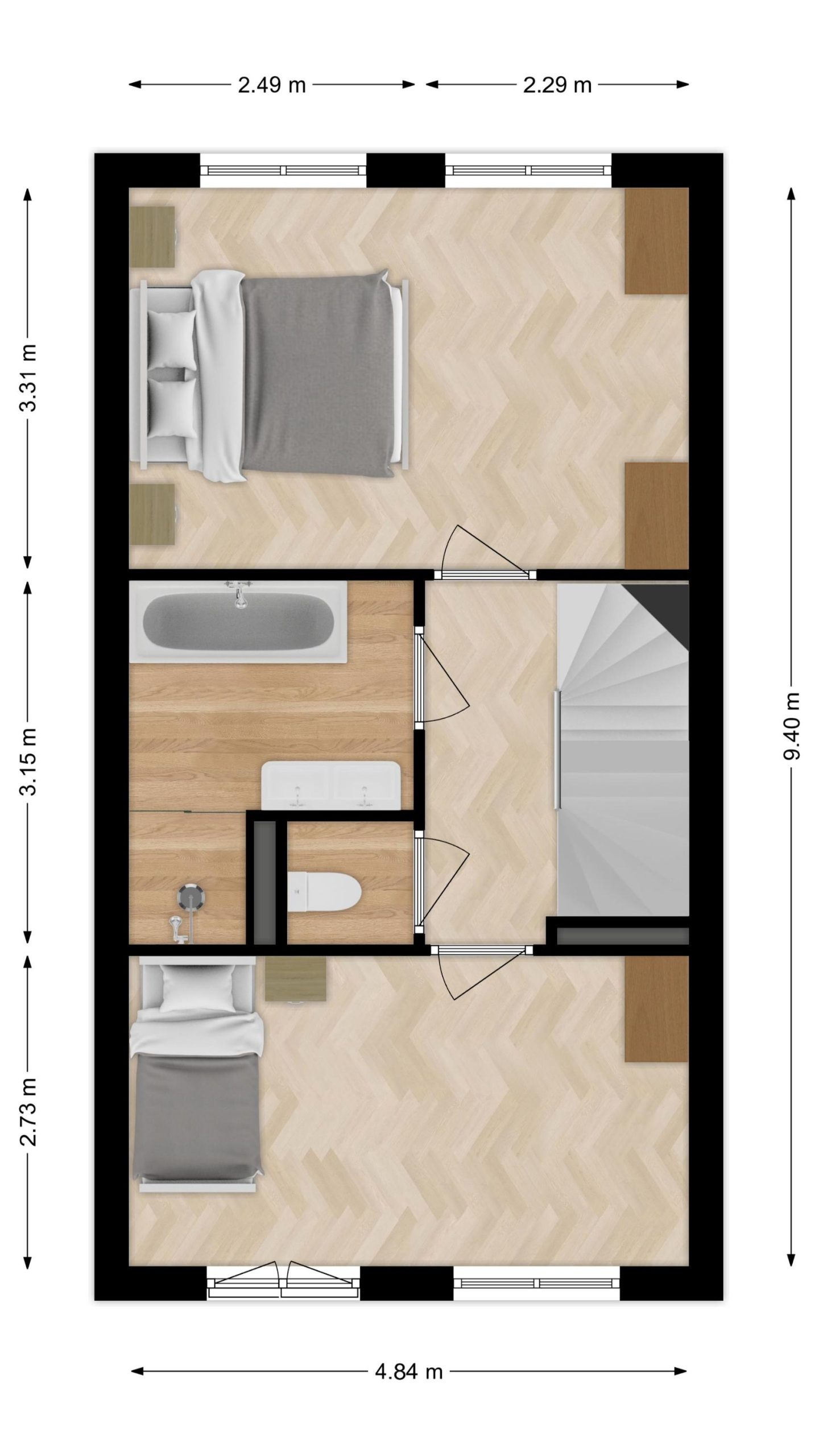 Overloop met toegang tot twee ruime slaapkamers over de volle breedte van de woning, die beide als hoofdslaapkamer kunnen dienen, een extra grote badkamer en een separate toiletruimte.