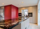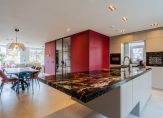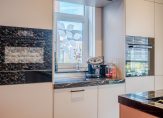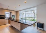 Via een fraaie en brede taatsdeur komt u vervolgens in ruime living met aan voorzijde karakteristieke erker en de luxe Leicht keuken met royaal en zwevend kookeiland met Miele inbouwapparatuur (koelkast en vriezer (AEG), vaatwasser, inductieplaat met ingebouwde kookveldafzuiging, Quooker kraan, oven en stoomoven).