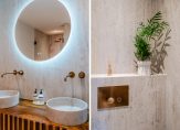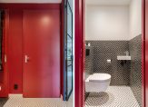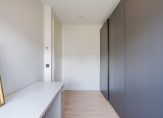 Zij-entree, ruime ontvangst-hal met meterkast, regelunit voor de vloerverwarming en toiletruimte met bewegingsmelder.