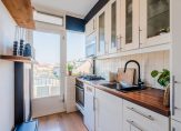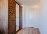 Entree: ruime hal met diepe inbouwkast (met aansluitingen wasapparatuur) en laminaatvloer, betegelde toiletruimte met staand closet en fontein, geheel betegelde badkamer met douchecabine, wastafelmeubel en electrische afzuiging, royale en lichte (mede vanwege extra zijraam) L-vormige woonkamer met ‘eetkamer’ (oorspronkelijke 3e slaapkamer) met vaste kast, zowel woon- als eetkamer hebben een deur naar het op het zuiden gelegen balkon, aan de achterzijde van de woning zijn een tweetal slaapkamers, waarvan de grote slaapkamer is voorzien van een deur naar het 2e balkon. De keuken is tussen de slaapkamers, en compleet ingericht met inbouwapparatuur, o.a. 4 pits-gaskookplaat, afzuigkap, electrische oven, koel-/vrieskast, magnetron en (losse) vaatwasser. Ook via de keuken is het balkon te bereiken.