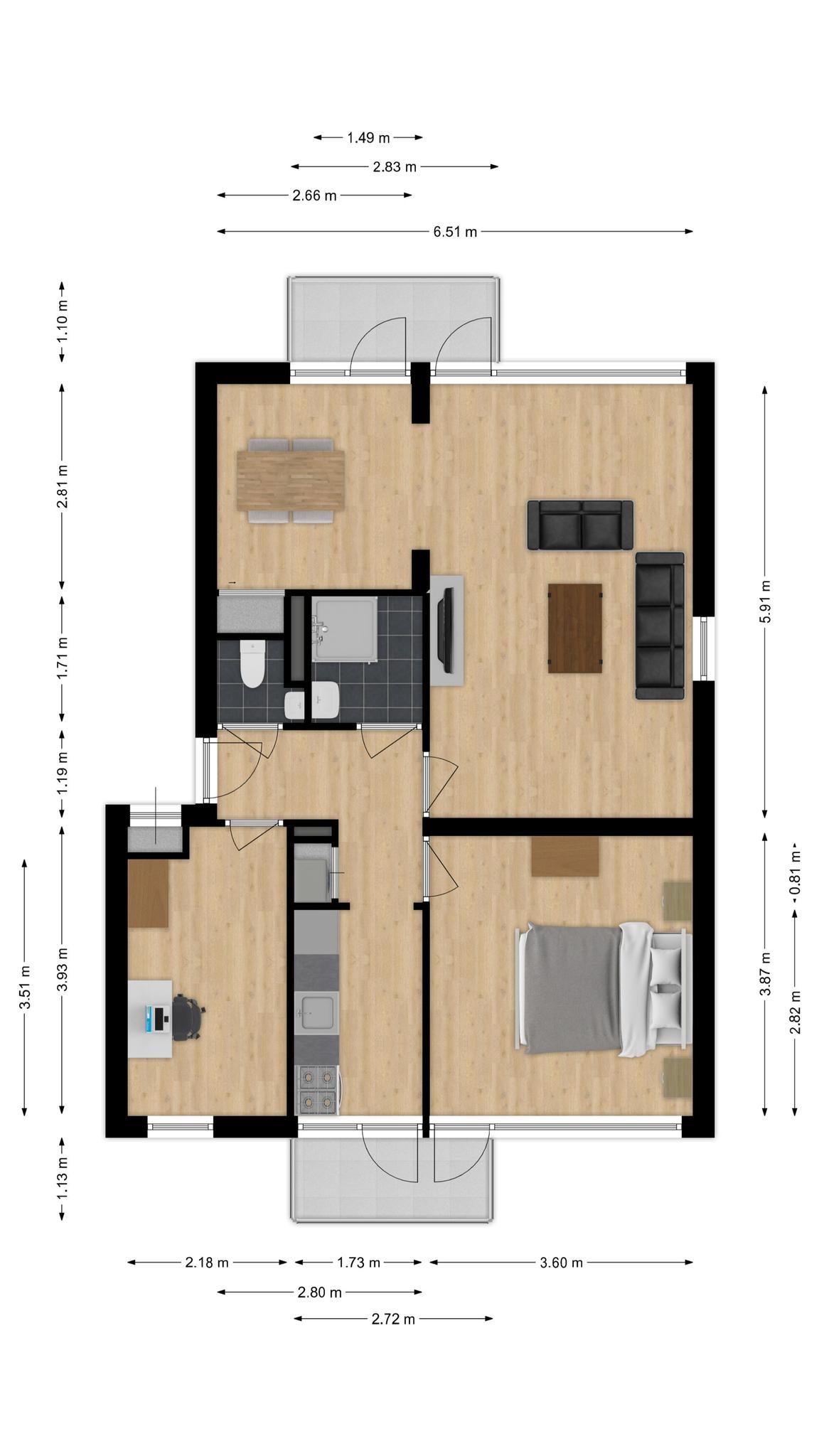 Woonkamer : ca. 5.91 x 3.60 m + eetkamer 2.81 x 2.66 m
