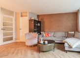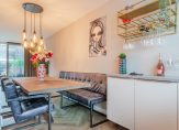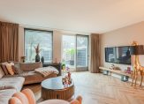 De tuingerichte woonkamer voelt ruim en licht aan dankzij de grote schuifpui en het royale raam. De vernieuwde afwerking en warme kleuren zorgen voor een eigentijdse, uitnodigende sfeer.