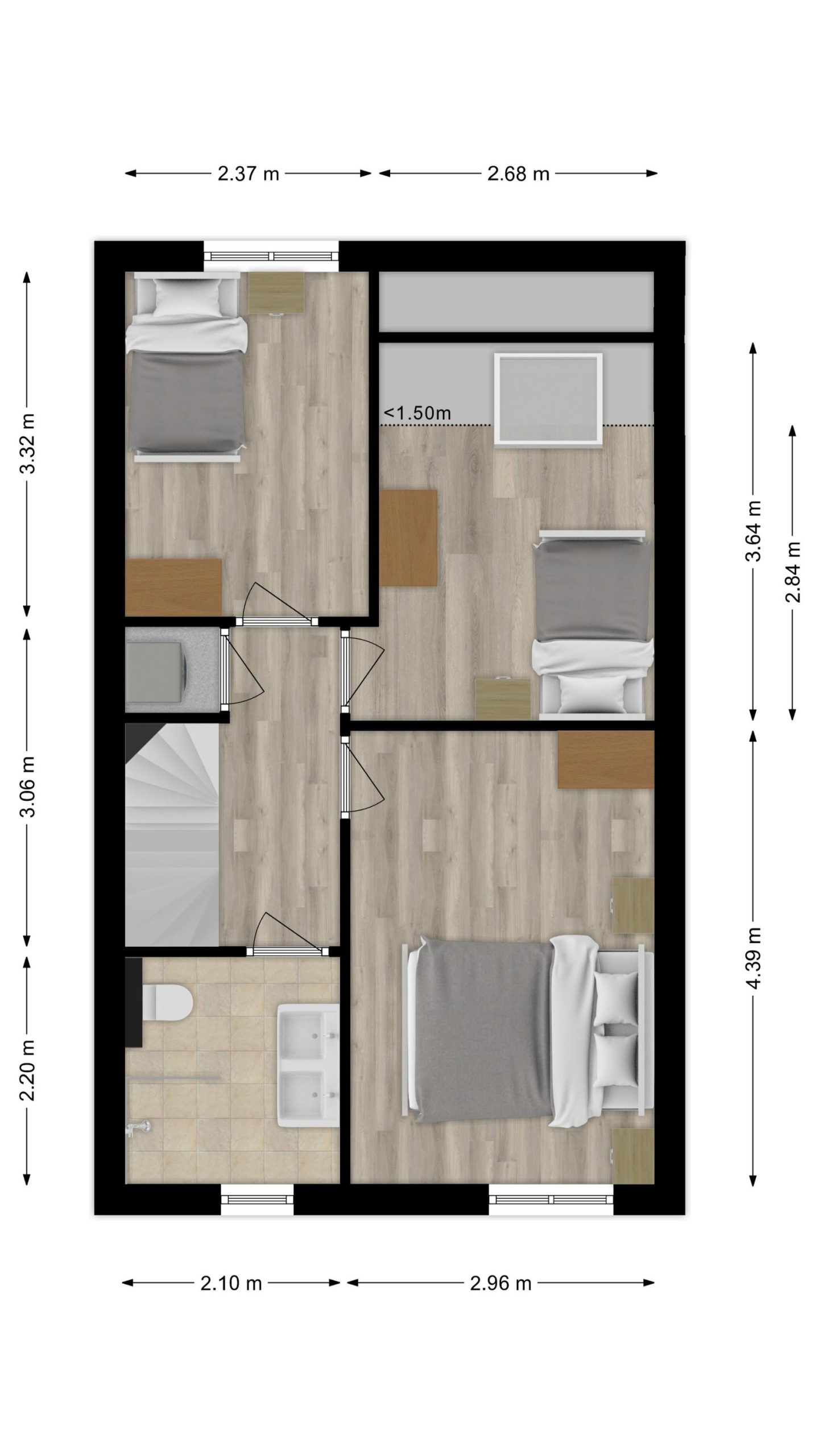 Op deze verdieping bevinden zich drie goed bemeten slaapkamers, waarvan twee voorzien zijn van handmatig bedienbare rolluiken. De gehele verdieping is voorzien van een lichte laminaatvloer die een rustige en moderne uitstraling creëert.