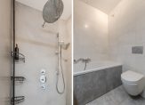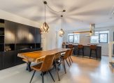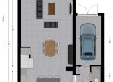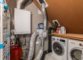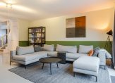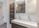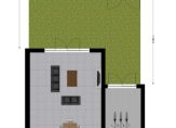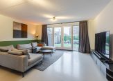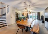 Het zitgedeelte is tuingericht en door de openslaande deuren naar achtertuin heerlijk licht. Tussen het zitgedeelte en de open keuken bevindt zich het eetgedeelte en een (trap)kast met regelunit voor de vloerverwarming.